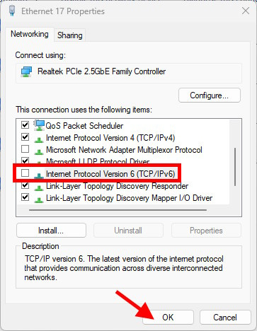 Scroll down until you find Internet Protocol Version 6, and UNcheck the box