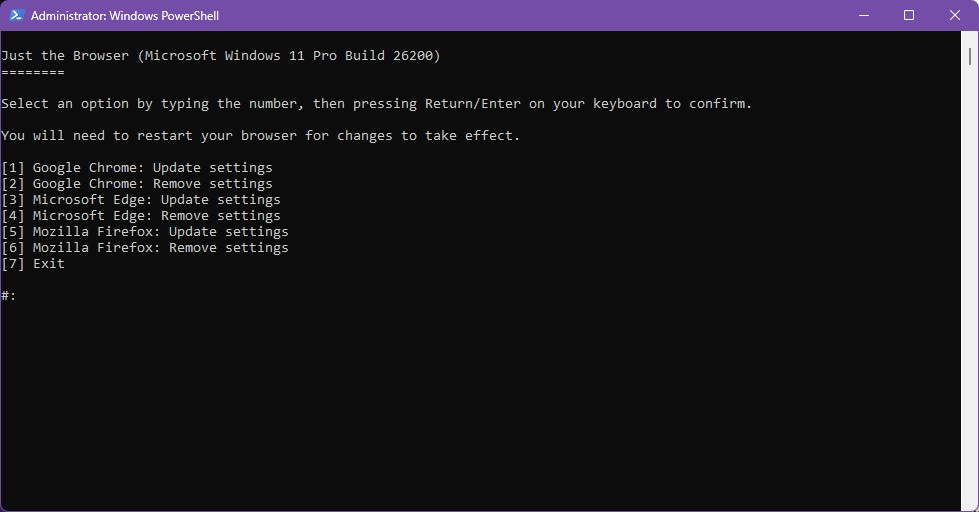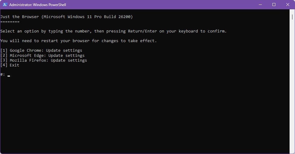 The script works for Chrome, Edge, and Firefox. For each browser, type the number before it and press enter.